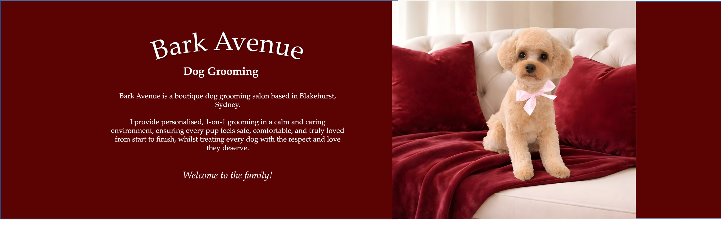 I created Bark Avenue to combine my passion for dogs with a grooming approach that places comfort, care, and well-being at the heart of every appointment. My goal is to ensure every pup not only looks and feels beautiful, but also feels safe, calm, and genuinely cared for throughout their grooming experience.